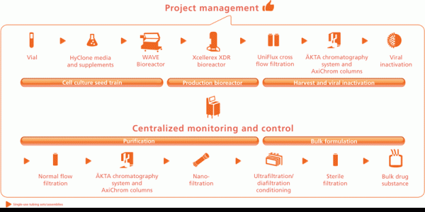 Figure 1: An example of a production process from cell culture to bulk drug substance. Figure is courtesy of Cytiva